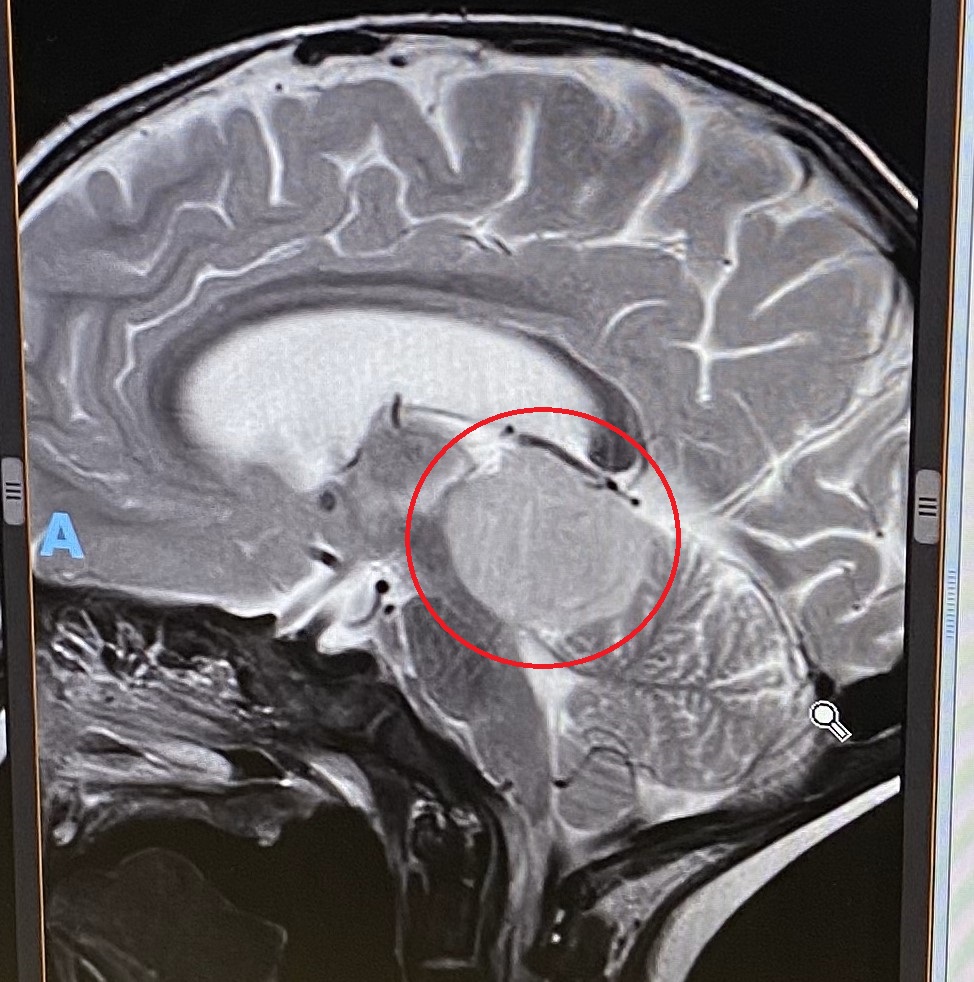 And here is a little reminder of the miracle two years ago today – an MRI image of Eloise’s brain on the morning with the tumour (circled), before it was removed. (Note: the cursor is placed where the neurosurgeon entered to get to the tumour!)